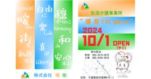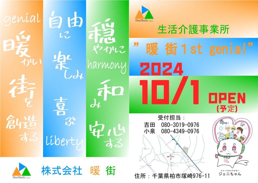 2024年10月1日 生活介護事業所 ”暖街1st genial” OPEN !!! 2024年8月23日 最終更新日時 : 2024年9月12日 暖街 柏市に新規の生活介護事業所をOPENします。 ご利用者募集中 住所:千葉県柏市塚崎976-11問い合わせ先:080-3019-0976(吉田) 080-4349-0976(小泉)